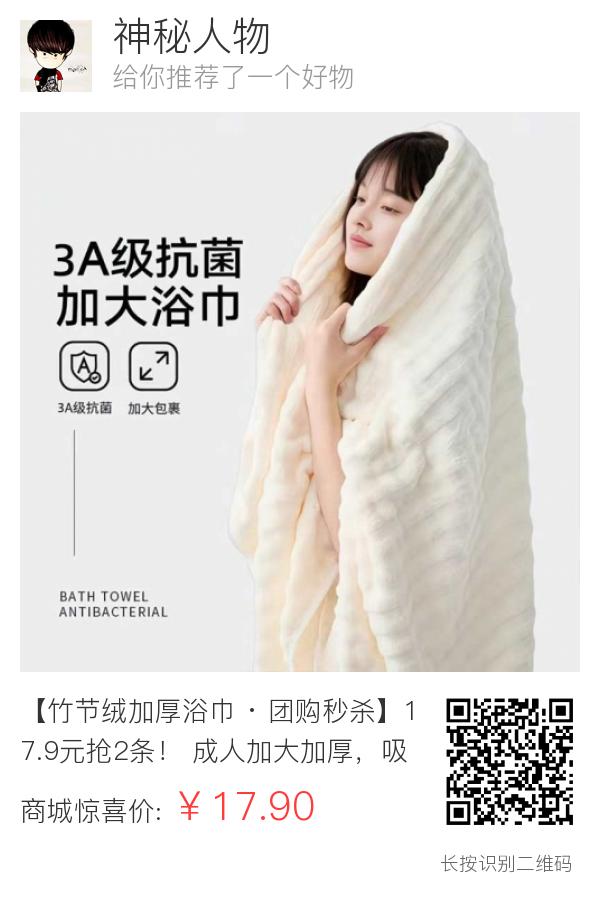 【竹节绒加厚浴巾 · 团购秒杀】17.9元抢2条! 成人加大加厚,吸水快、超柔软!