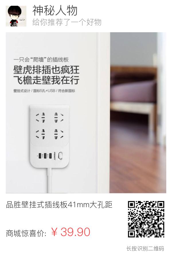 品胜壁挂式插线板41mm大孔距